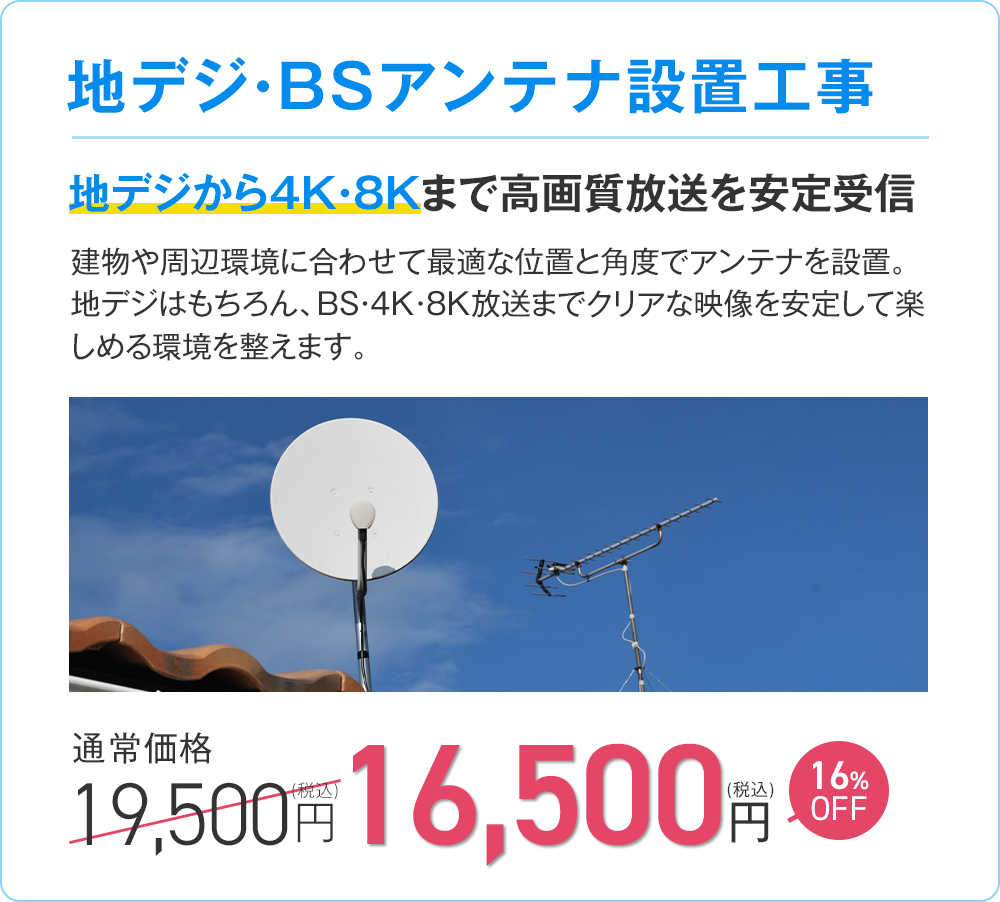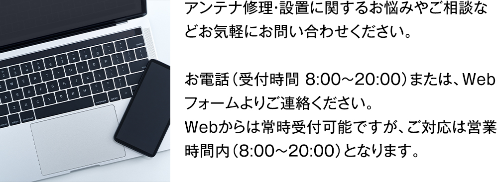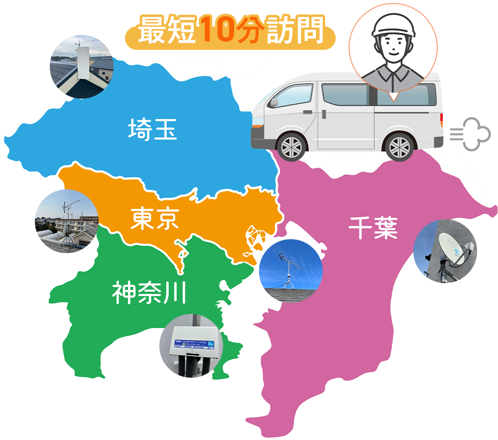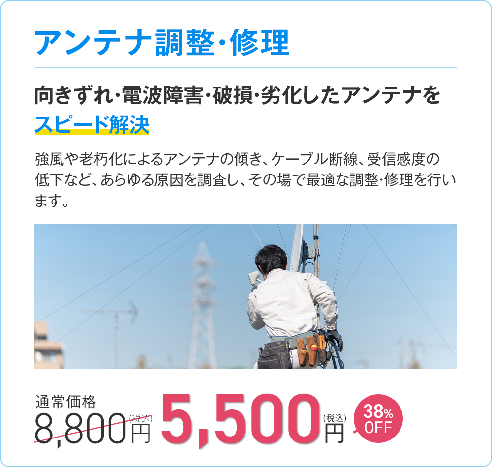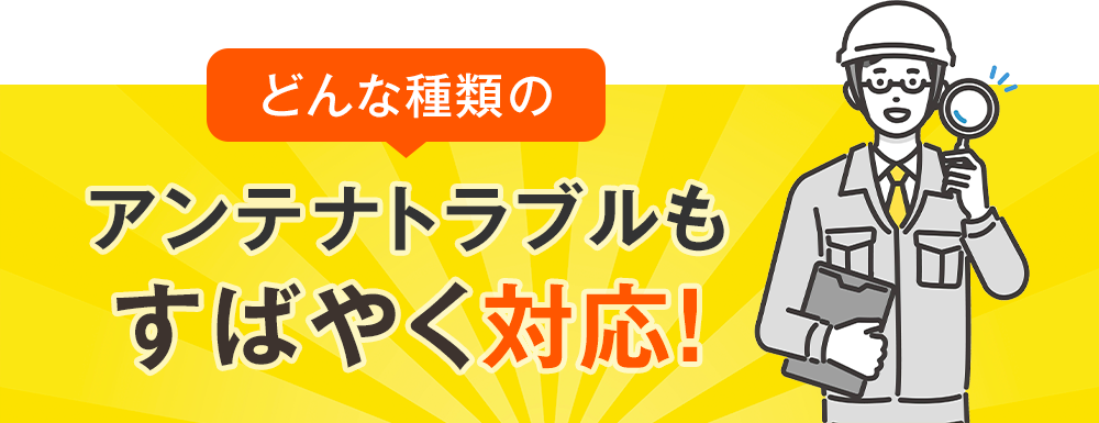 「急にテレビが映らなくなった」「台風後に映りが悪い」など、突然のアンテナトラブルにも最短即日で駆けつけます。