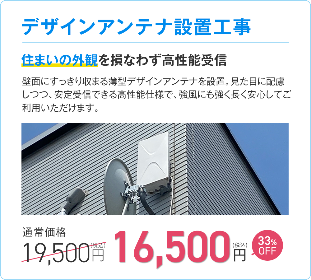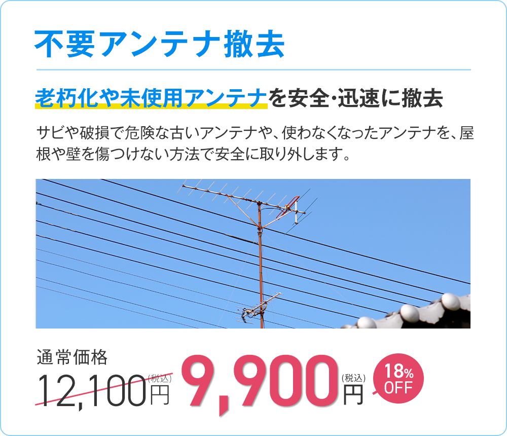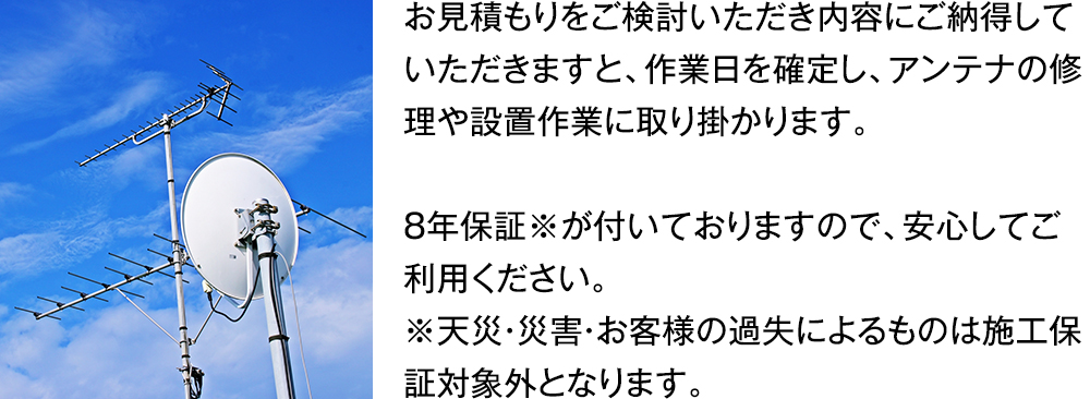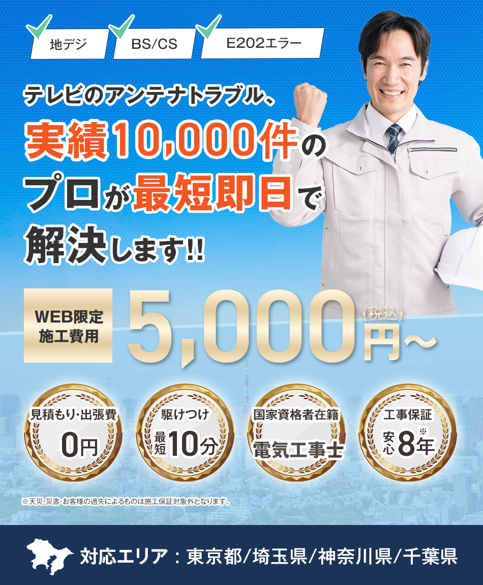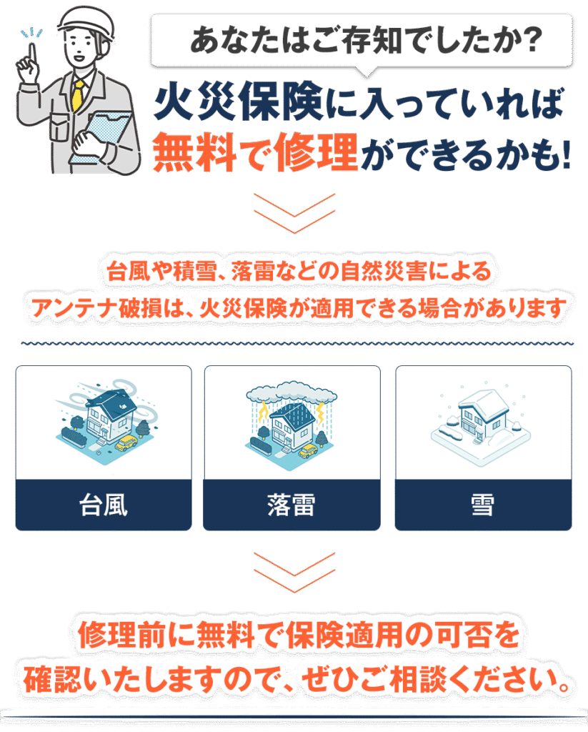 「急にテレビが映らなくなった」「台風後に映りが悪い」など、突然のアンテナトラブルにも最短即日で駆けつけます。
