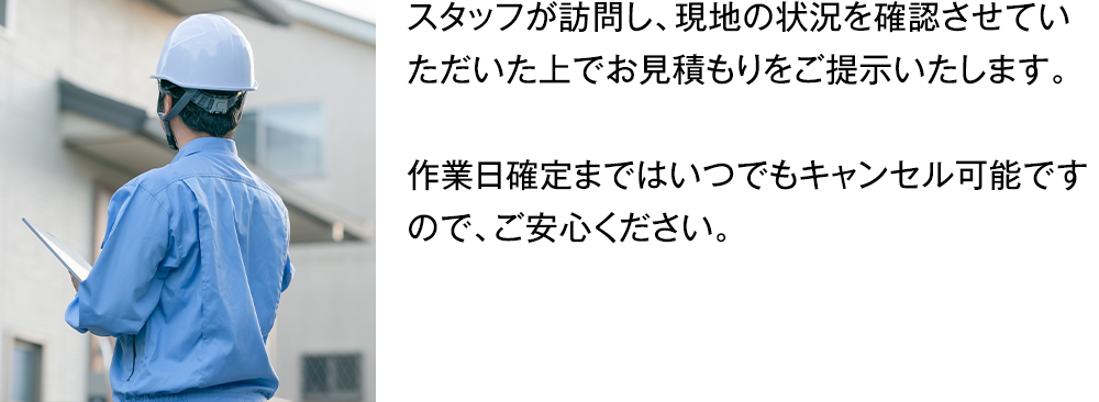 作業を始める前に必ず「現地調査」を行い、作業内容と料金を「お見積もり」として丁寧にご説明いたします。