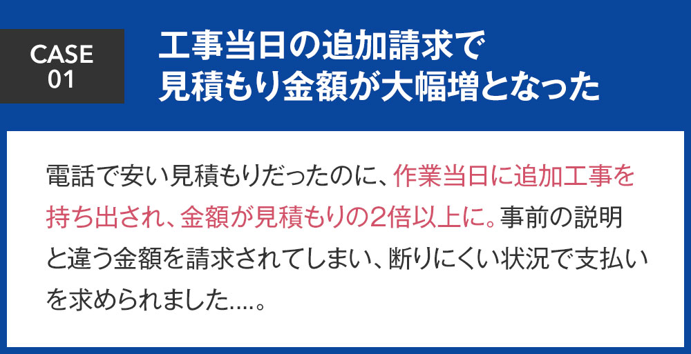 お客様がきちんと納得された後に作業を進めるので、作業後に「こんな費用は聞いていない」といった追加請求は一切ありません。初めての方でも安心してご依頼いただけます。