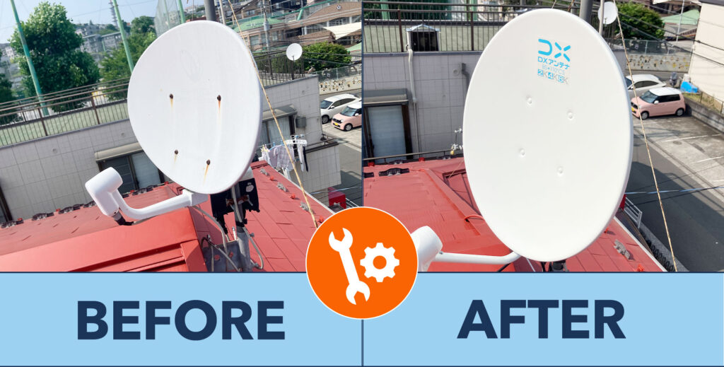 BSが映らない とのことでお電話いただいたお客様。点検の結果、アンテナ本体が故障している状態でしたので、BSアンテナ本体と配線の交換をさせていただきました。