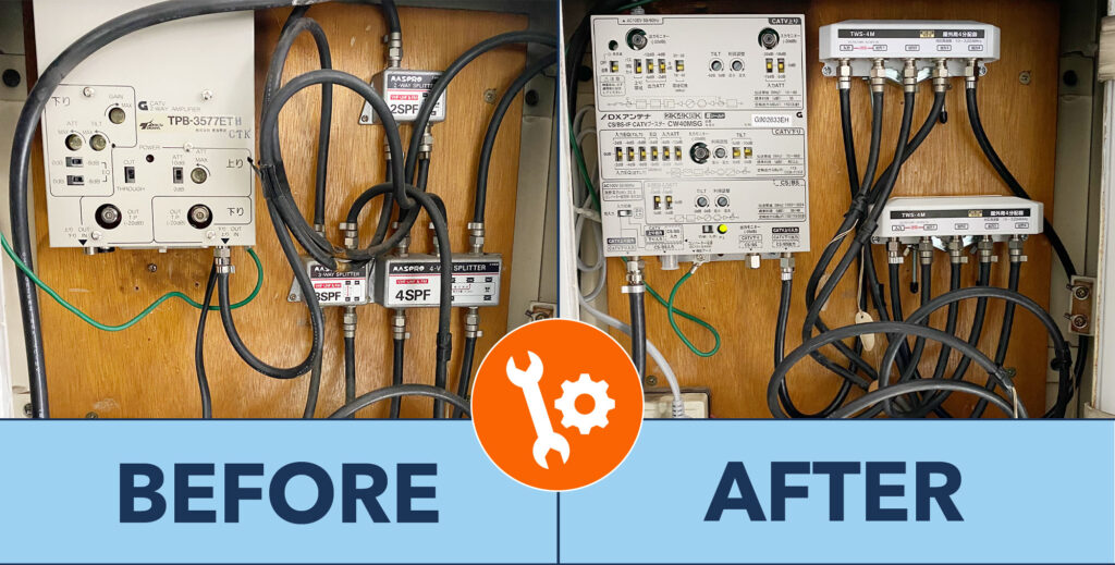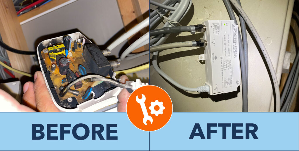 マンションの管理会社様から緊急のご連絡。マンション全体でテレビが映らないトラブルとのこと。即日お伺いし点検の結果、共同受信用ブースターの故障と判明。分配器にも経年劣化が見られたため、ブースターと分配器を交換。映らなくなってから3時間後には復旧することができました。
