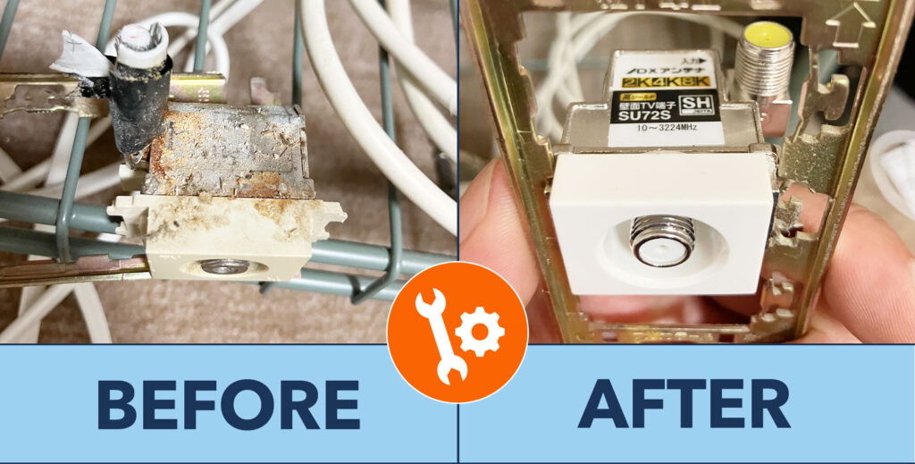 一部屋だけテレビが映らない、とご相談いただいたお客様。点検の結果、外のケーブルから雨水が侵入し、お部屋にある差込口が水没していました。ケーブル内の通電検査を実施したところケーブルは無事だったので、差込口のみを交換し無事復旧しました。