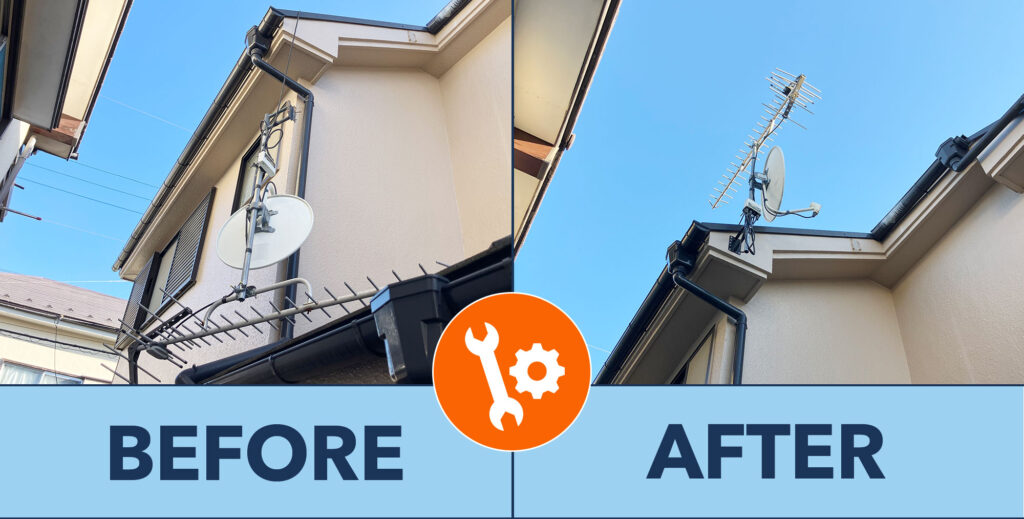 家の側面に設置していたアンテナが強風で落下してしまい「お隣さんに迷惑をかけたくないから」と急ぎご連絡をいただいたお客様。即日お伺いし点検させていただきました。アンテナ類に故障は見られなかったので、責任を持って再設置工事をいたしました。もしかしたら他社さんが最初に工事をした際に、ネジの固定が甘かったのかもしれないです。