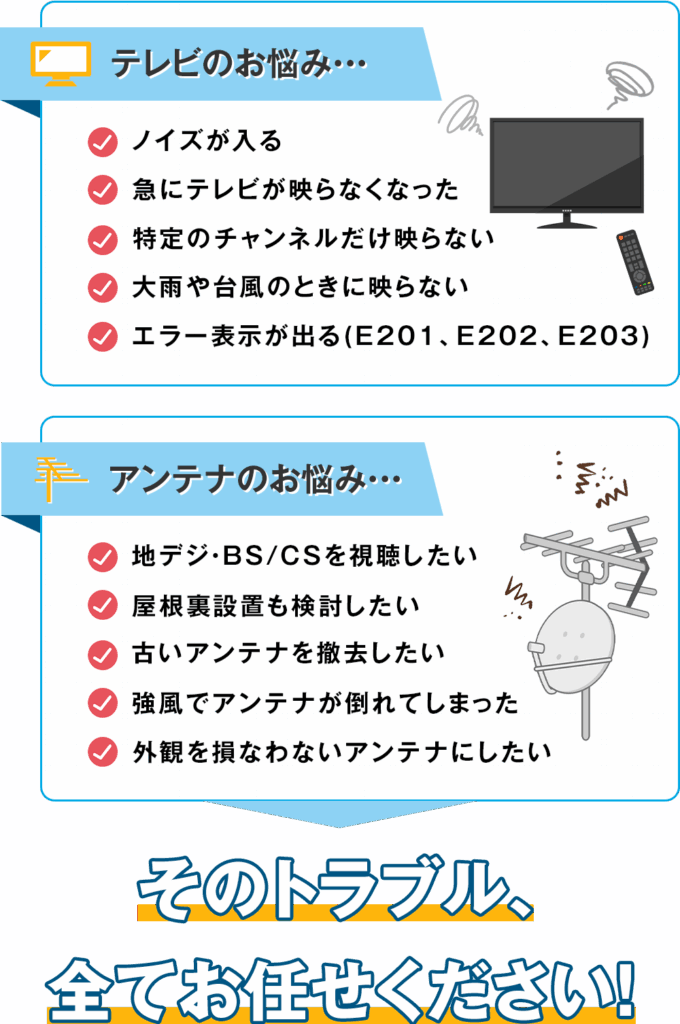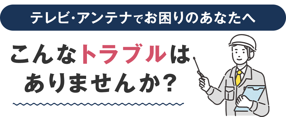 「突然テレビが映らない、台風後に映りが悪い、他社で断られた…。」そんなお困りごとも、 経験豊富なスタッフが原因をしっかり特定し、その場でスピード解決いたします。